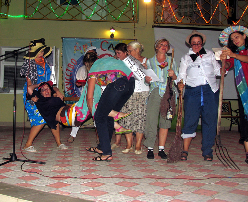 Поэтому мы обрадовались дождю, шквальному ветру и похолоданию, решив, что эти специальные условия помогут нам не отвлекаться на пляж, а полностью отдаться созданию финальных капустников. И вечер показал, что погода и мы старались не зря.