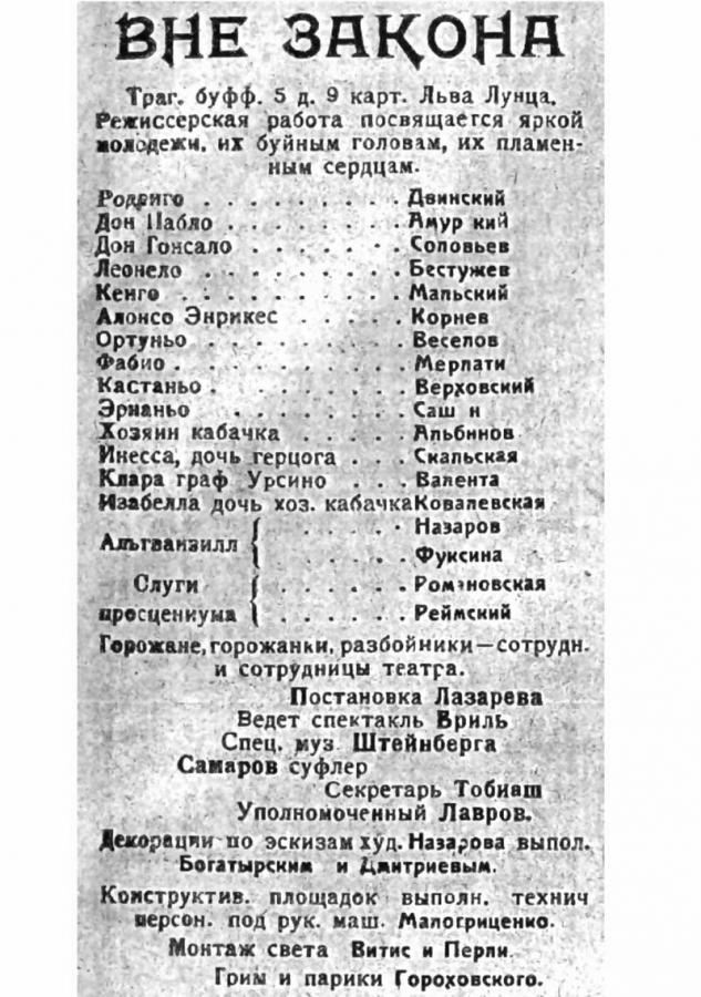 В 4-м номере «Силуэтов» за 1923 г. появляется анонс: «Одной из ближайших премьер госдрамы явится новая пьеса Льва Лунца “Вне закона”. Ставит пьесу Л.Ф. Лазарев. Главную роль играет Корнев».