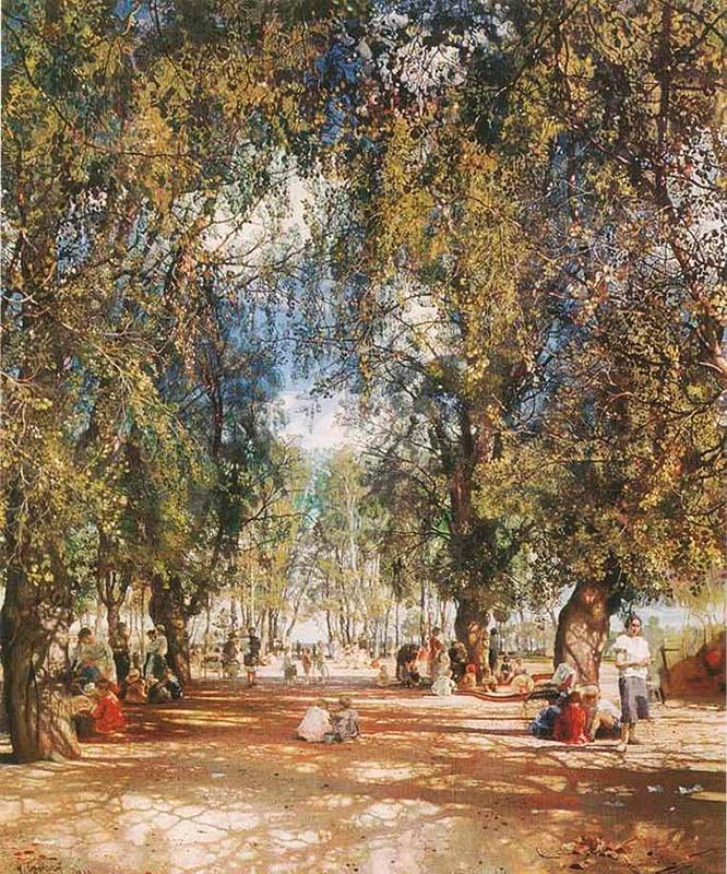 При всем том художник нечасто, но продолжал писать пейзажи в своей манере, среди них великолепная «Аллея парка» (1930). С этой работой связана любопытная и в чем-то знаковая история. Один исследователь заметил, что композиция картины удивительно похожа на другую работу художника – «Аллею парка в Риме». Это полотно долго считали утерянным, а его репродукция была опубликована только в редком издании 1929 года. Рентгенограмма помогла найти «пропавшую» римскую аллею – прямо под советской аллеей 1930-го года. Художник не стал счищать изображение, а просто внес в него мелкие изменения: «переодел» прохожих, убрал всякие буржуазные серсо и мраморные статуи, немного видоизменил деревья. Так солнечный итальянский парк легким движением кисти превратился в советский.