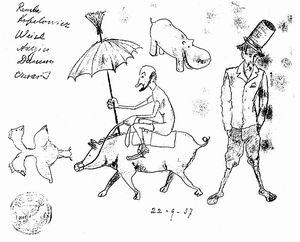 А рядом с портретом Когана — моментальный набросок, буквально несколько штрихов — борода, брови, пучки волос вокруг лысины. Средства минимальные — а образ угадывается. На этом же листе, датированном, кстати, 1931 годом, и еще один рисунок, но с более сложной композицией — всадник на... свинье. И вот здесь мне бы хотелось отвлечься и поговорить о юморе Жаботинского.