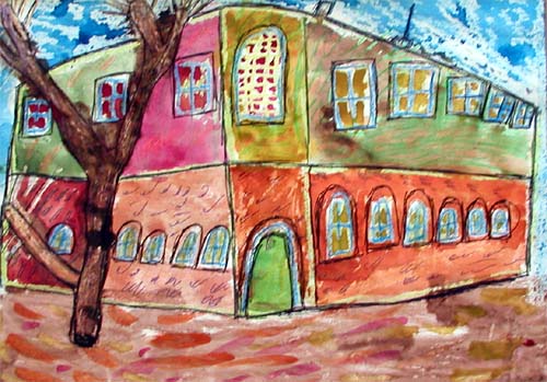 В прошлом году мы начали выпускать еврейскую праздничную открытку. Сейчас готовим выставку «Еврейская Одесса». Она посвящается 210-летнему юбилею города. На работах изображены дома, связанные с еврейской историей Одессы. Работу над этой темой мы начали в летнем семейном лагере в 2002 г. и продолжили на 2-х детских площадках этого года. Техника исполнения смешанная — от 2 до 4 в каждой картине — восковая пастель, акварель, гелиевые ручки, блестящий клей. Работы получились очень интересные, своеобразные — импрессионисты нам бы позавидовали.